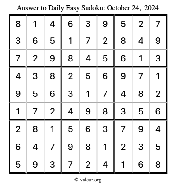 Here is the October 24, 2024 easy sudoku puzzle. You are welcome to print a copy to solve by hand. For your convenience, we have also included the solution further down the page so you can check your work.