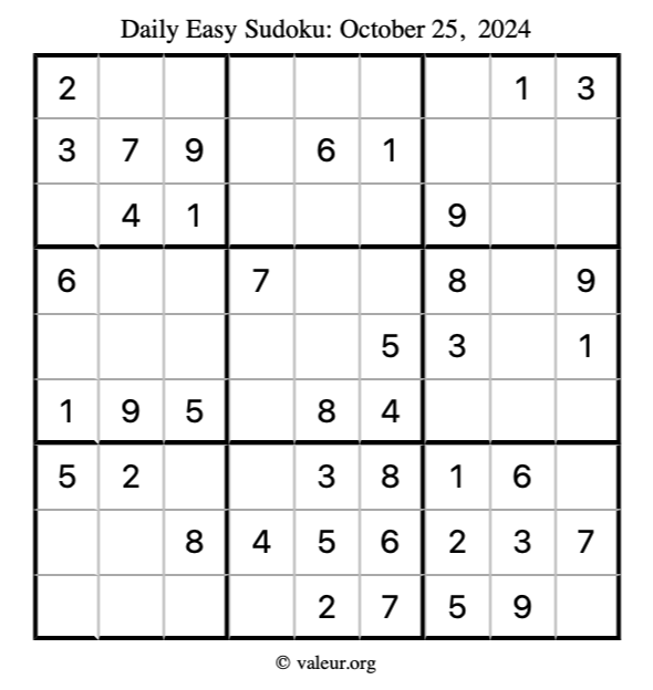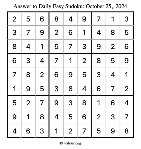 Here is the October 25, 2024 easy sudoku puzzle. You are welcome to print a copy to solve by hand. For your convenience, we have also included the solution further down the page so you can check your work.