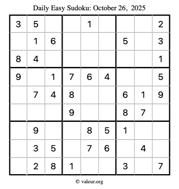 Here is the October 26, 2025 easy sudoku puzzle. You are welcome to print a copy to solve by hand. For your convenience, we have also included the solution further down the page so you can check your work.