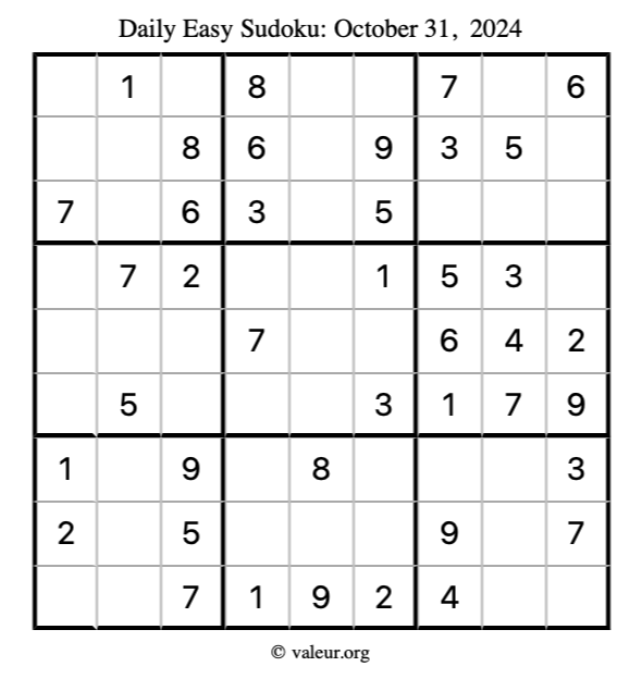 Here is the October 31, 2024 easy sudoku puzzle. You are welcome to print a copy to solve by hand. For your convenience, we have also included the solution further down the page so you can check your work.