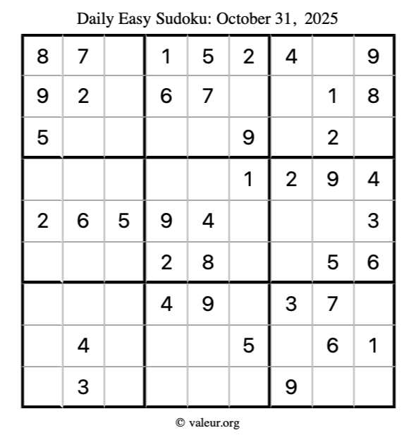 Here is the October 31, 2025 easy sudoku puzzle. You are welcome to print a copy to solve by hand. For your convenience, we have also included the solution further down the page so you can check your work.
