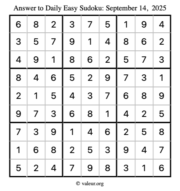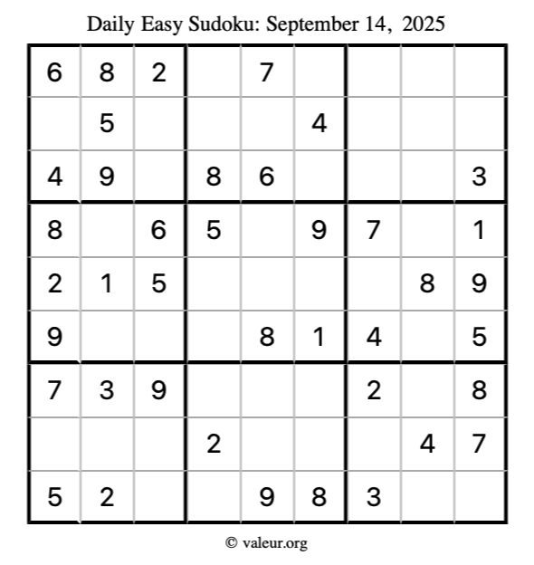 Here is the September 14, 2025 easy sudoku puzzle. You are welcome to print a copy to solve by hand. For your convenience, we have also included the solution further down the page so you can check your work.