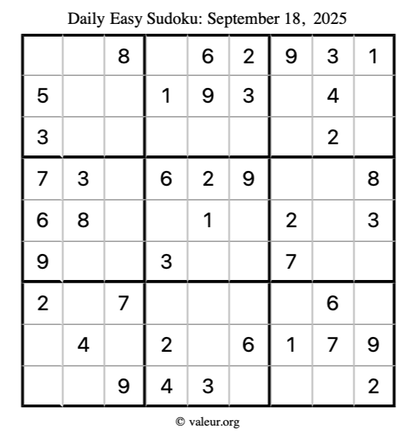 Here is the September 18, 2025 easy sudoku puzzle. You are welcome to print a copy to solve by hand. For your convenience, we have also included the solution further down the page so you can check your work.