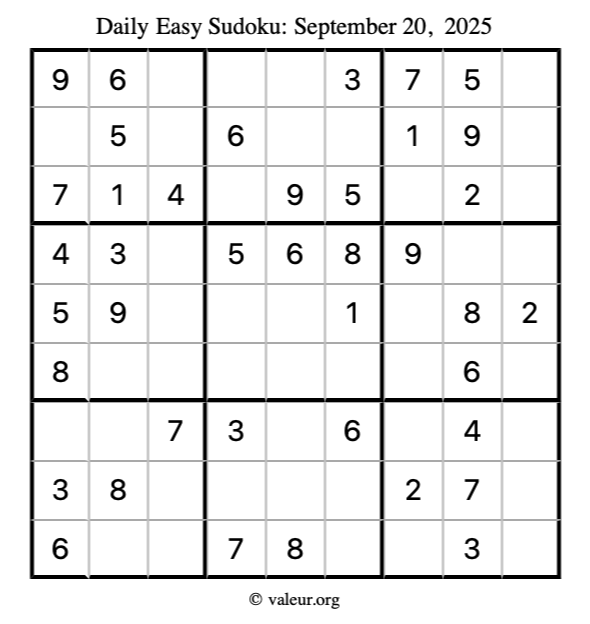 Here is the September 20, 2025 easy sudoku puzzle. You are welcome to print a copy to solve by hand. For your convenience, we have also included the solution further down the page so you can check your work.