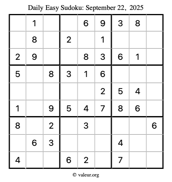 Here is the September 22, 2025 easy sudoku puzzle. You are welcome to print a copy to solve by hand. For your convenience, we have also included the solution further down the page so you can check your work.