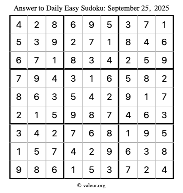 As promised, here is the solution to the September 25, 2025 easy sudoku puzzle: