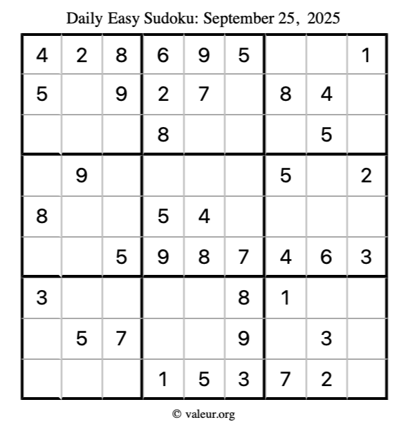 Here is the September 25, 2025 easy sudoku puzzle. You are welcome to print a copy to solve by hand. For your convenience, we have also included the solution further down the page so you can check your work.