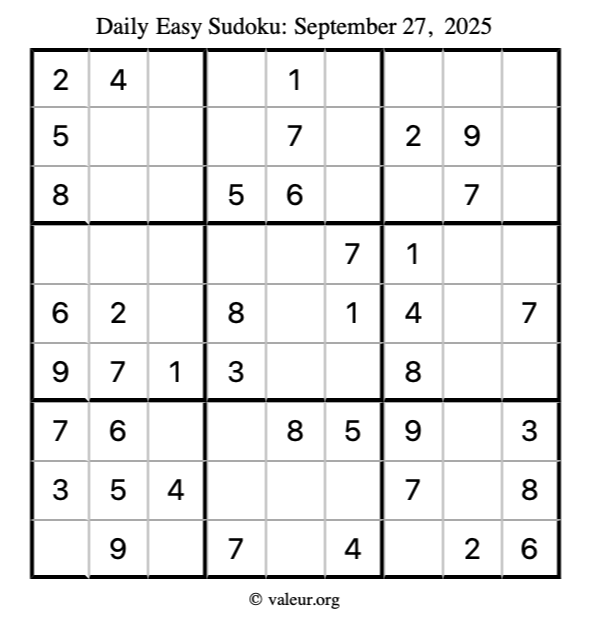Here is the September 27, 2025 easy sudoku puzzle. You are welcome to print a copy to solve by hand. For your convenience, we have also included the solution further down the page so you can check your work.