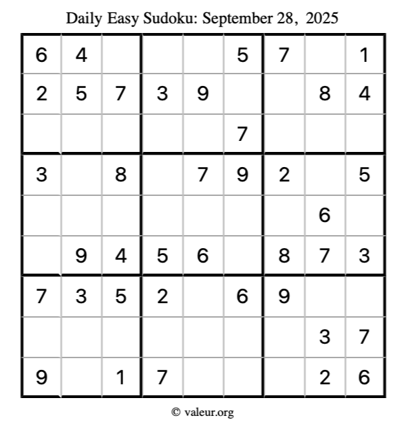 Here is the September 28, 2025 easy sudoku puzzle. You are welcome to print a copy to solve by hand. For your convenience, we have also included the solution further down the page so you can check your work.