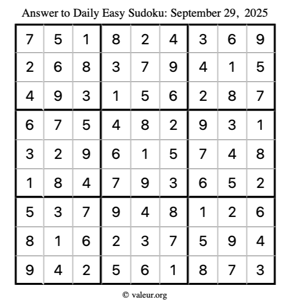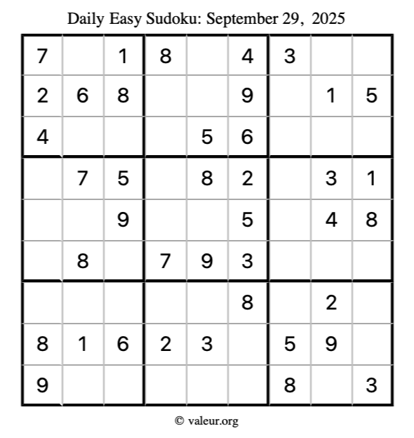 Here is the September 29, 2025 easy sudoku puzzle. You are welcome to print a copy to solve by hand. For your convenience, we have also included the solution further down the page so you can check your work.
