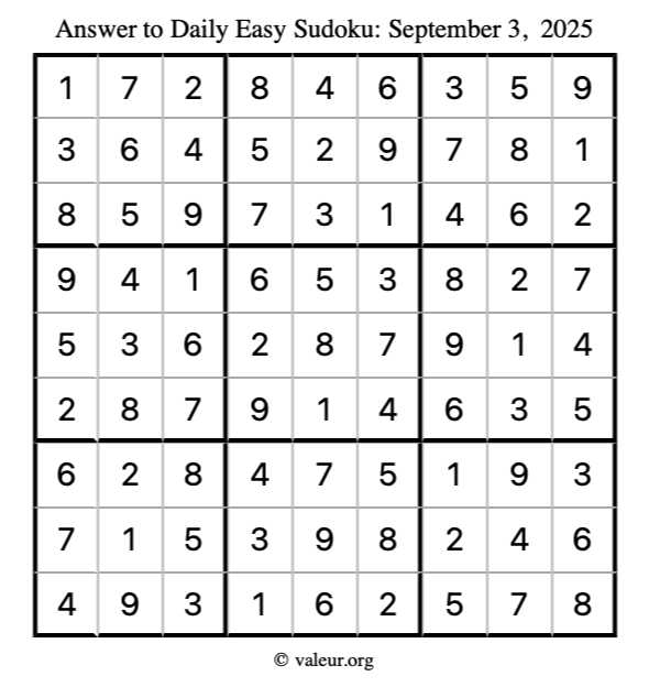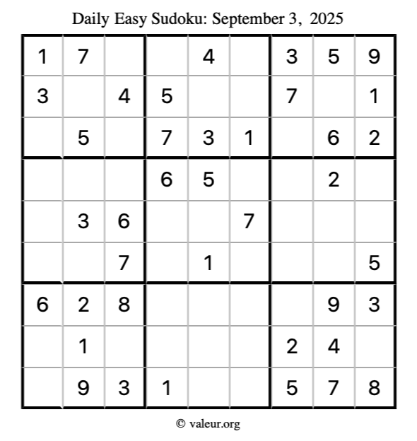 Here is the September 3, 2025 easy sudoku puzzle. You are welcome to print a copy to solve by hand. For your convenience, we have also included the solution further down the page so you can check your work.