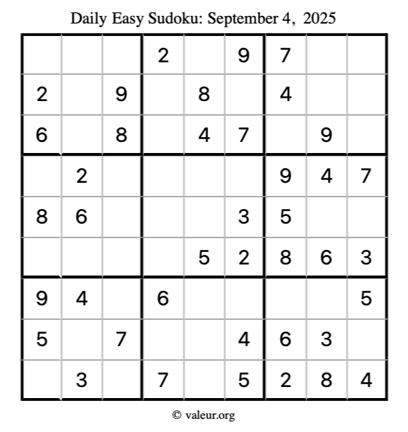 Here is the September 4, 2025 easy sudoku puzzle. You are welcome to print a copy to solve by hand. For your convenience, we have also included the solution further down the page so you can check your work.
