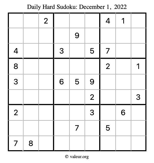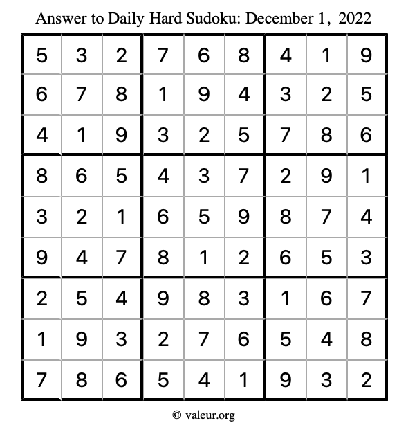 Here is the December 1, 2022 hard sudoku puzzle. You are welcome to print a copy to solve by hand. For your convenience, we have also included the solution further down the page so you can check your work.