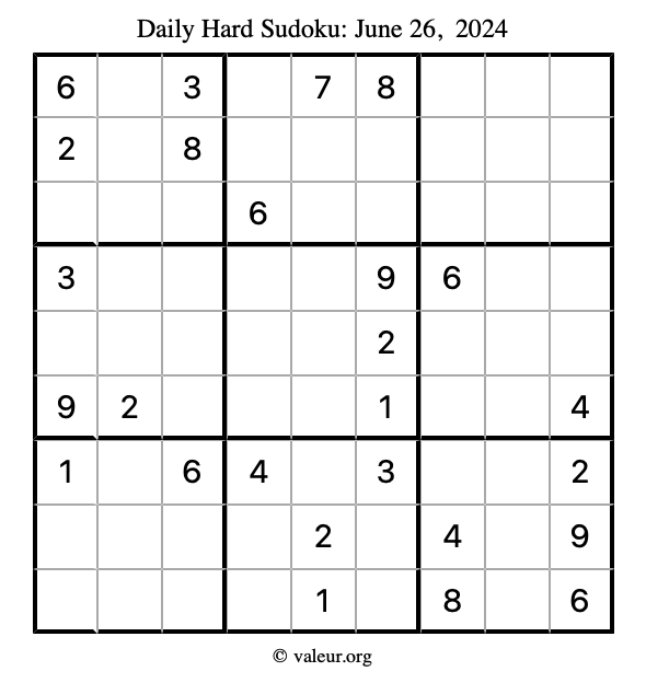 Here is the June 26, 2024 hard sudoku puzzle. You are welcome to print a copy to solve by hand. For your convenience, we have also included the solution further down the page so you can check your work.