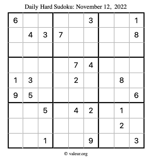 Here is the November 12, 2022 hard sudoku puzzle. You are welcome to print a copy to solve by hand. For your convenience, we have also included the solution further down the page so you can check your work.