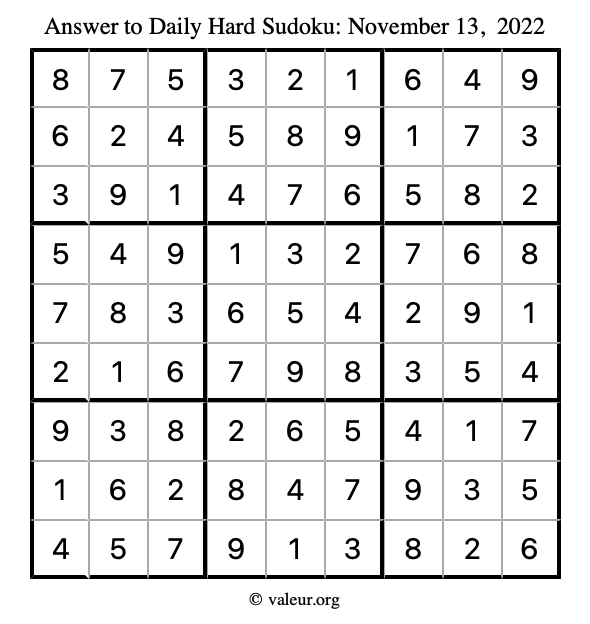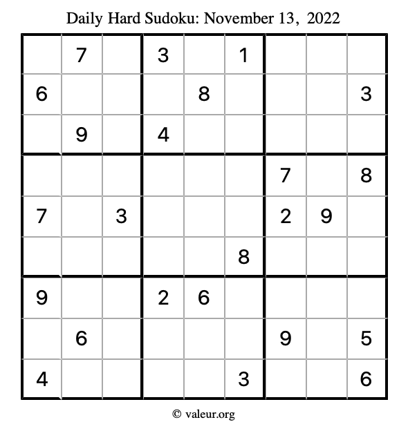 Here is the November 13, 2022 hard sudoku puzzle. You are welcome to print a copy to solve by hand. For your convenience, we have also included the solution further down the page so you can check your work.