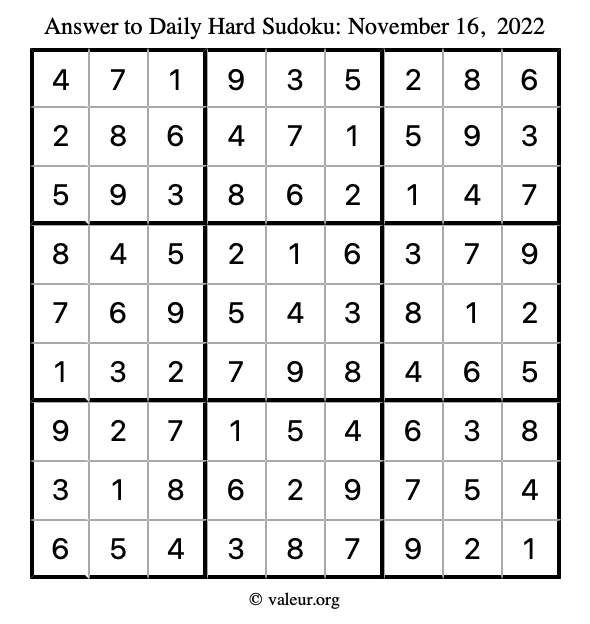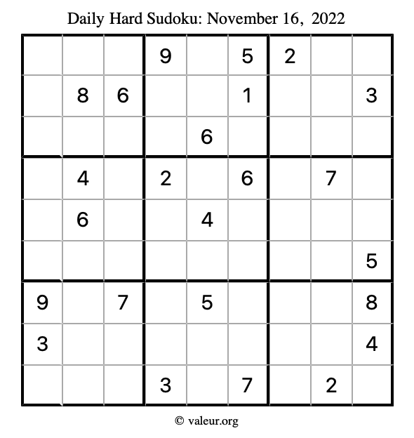 Here is the November 16, 2022 hard sudoku puzzle. You are welcome to print a copy to solve by hand. For your convenience, we have also included the solution further down the page so you can check your work.