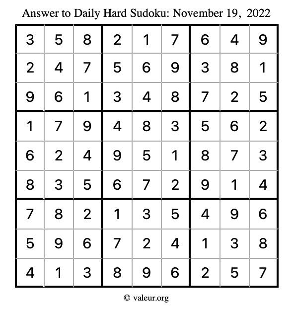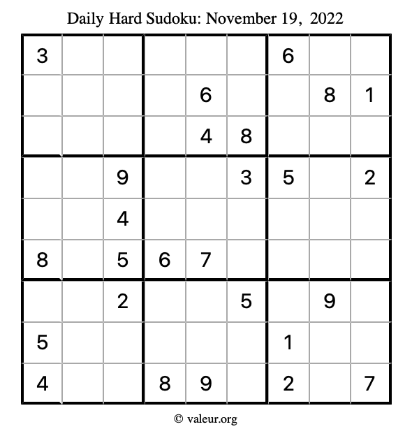 Here is the November 19, 2022 hard sudoku puzzle. You are welcome to print a copy to solve by hand. For your convenience, we have also included the solution further down the page so you can check your work.