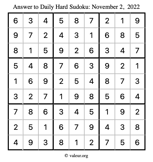 Here is the November 2, 2022 hard sudoku puzzle. You are welcome to print a copy to solve by hand. For your convenience, we have also included the solution further down the page so you can check your work.