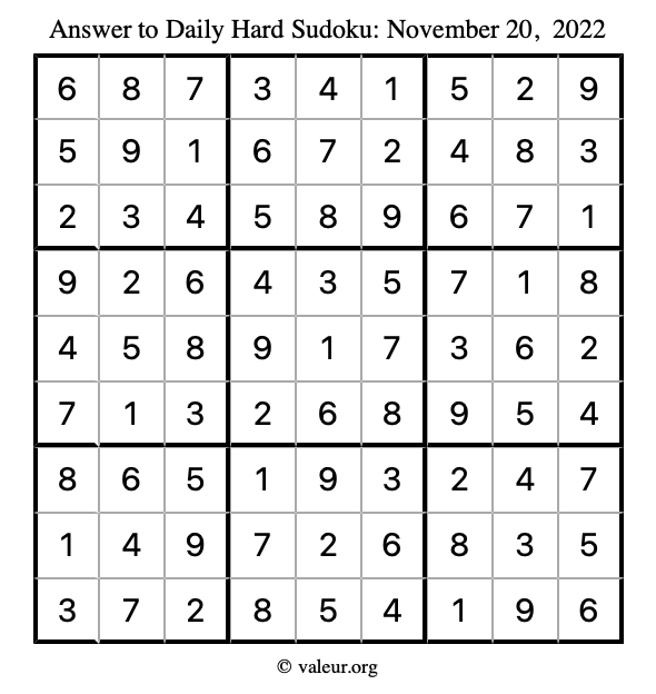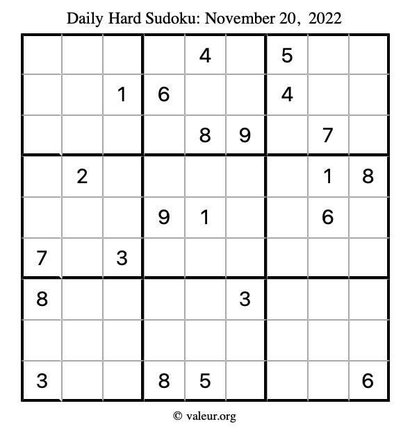 Here is the November 20, 2022 hard sudoku puzzle. You are welcome to print a copy to solve by hand. For your convenience, we have also included the solution further down the page so you can check your work.