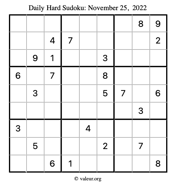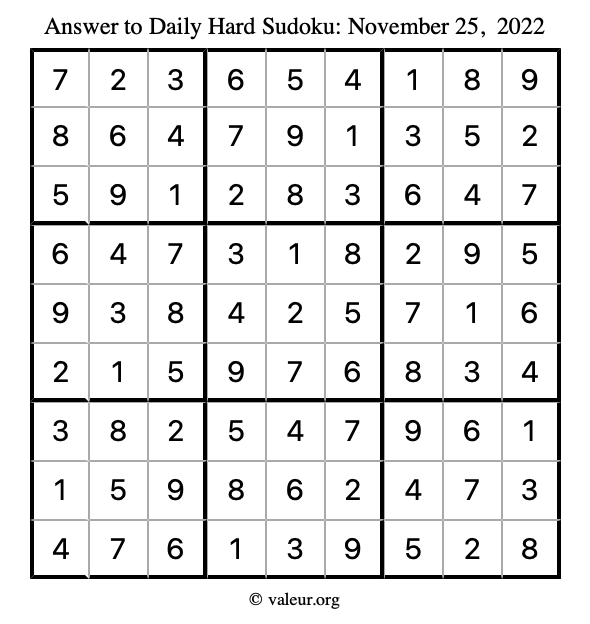 Here is the November 25, 2022 hard sudoku puzzle. You are welcome to print a copy to solve by hand. For your convenience, we have also included the solution further down the page so you can check your work.