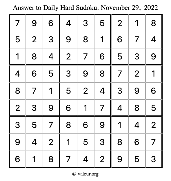 Here is the November 29, 2022 hard sudoku puzzle. You are welcome to print a copy to solve by hand. For your convenience, we have also included the solution further down the page so you can check your work.