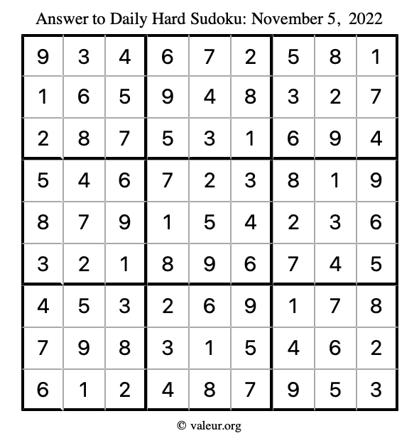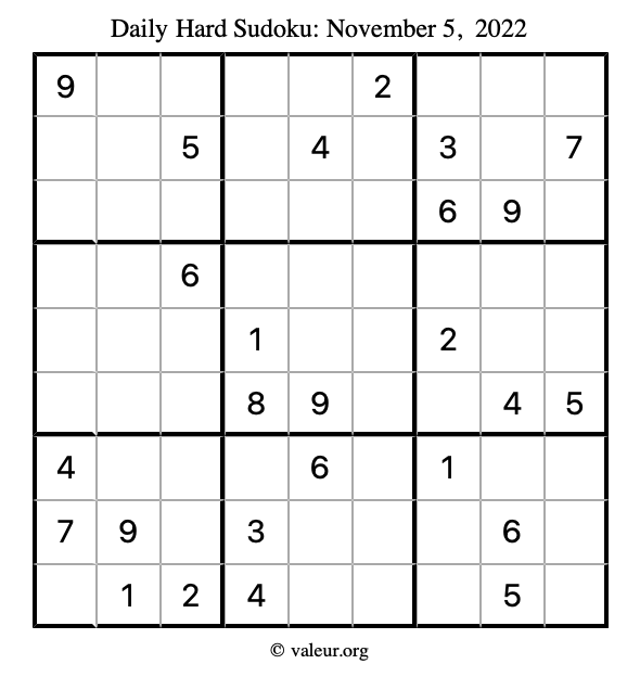 Here is the November 5, 2022 hard sudoku puzzle. You are welcome to print a copy to solve by hand. For your convenience, we have also included the solution further down the page so you can check your work.
