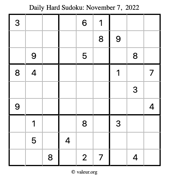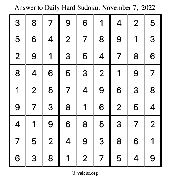 Here is the November 7, 2022 hard sudoku puzzle. You are welcome to print a copy to solve by hand. For your convenience, we have also included the solution further down the page so you can check your work.
