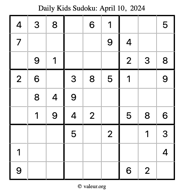Here is the April 10, 2024 kids sudoku puzzle. You are welcome to print a copy to solve by hand. For your convenience, we have also included the solution further down the page so you can check your work.