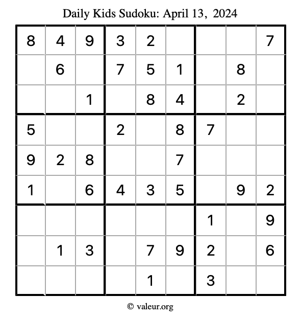 Here is the April 13, 2024 kids sudoku puzzle. You are welcome to print a copy to solve by hand. For your convenience, we have also included the solution further down the page so you can check your work.