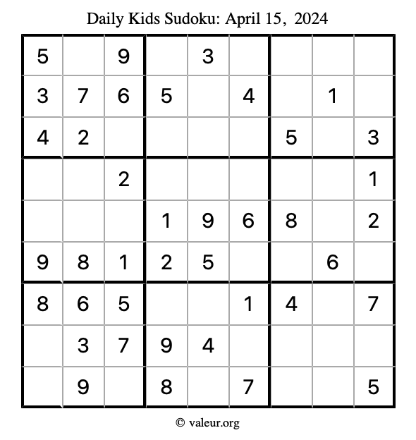 Here is the April 15, 2024 kids sudoku puzzle. You are welcome to print a copy to solve by hand. For your convenience, we have also included the solution further down the page so you can check your work.