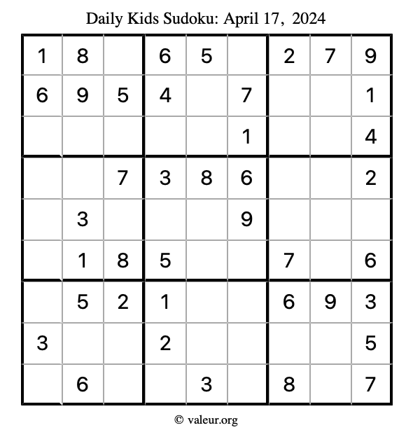Here is the April 17, 2024 kids sudoku puzzle. You are welcome to print a copy to solve by hand. For your convenience, we have also included the solution further down the page so you can check your work.