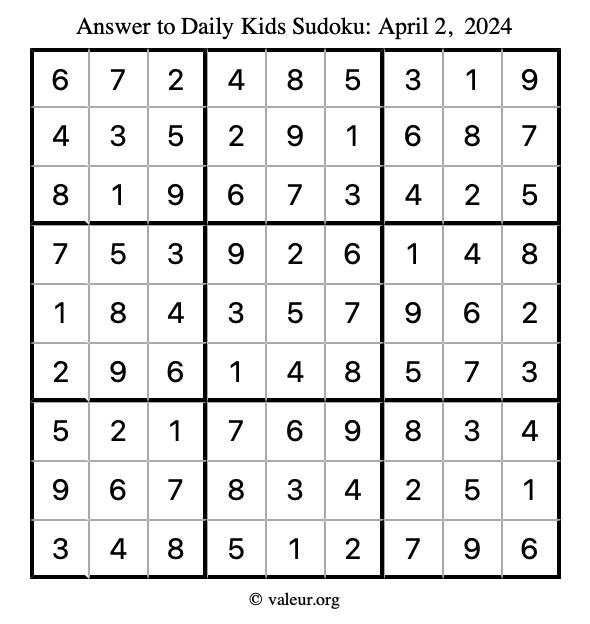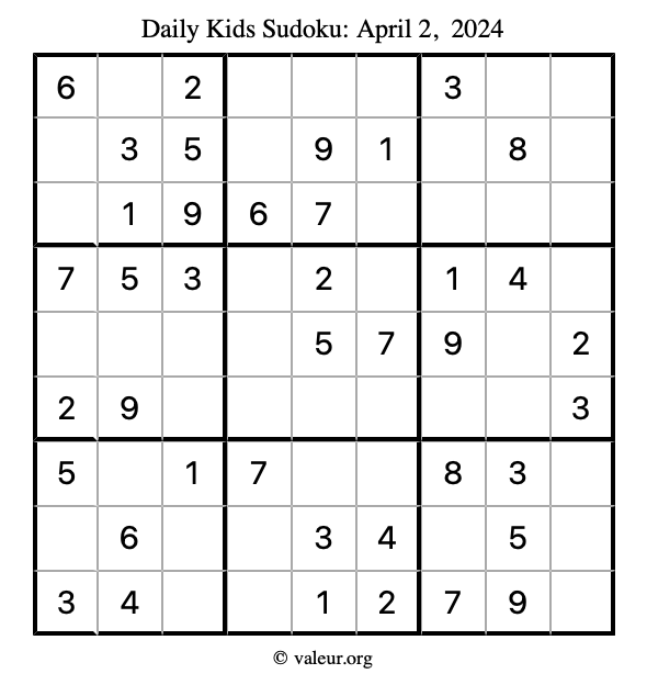 Here is the April 2, 2024 kids sudoku puzzle. You are welcome to print a copy to solve by hand. For your convenience, we have also included the solution further down the page so you can check your work.