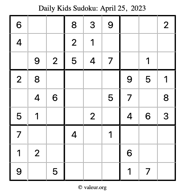 Kids Sudoku April 25, 2023 is not the only sudoku puzzle we have. We create a new kids sudoku puzzle every day for you to print and solve. Check out today's kids sudoku puzzle here!