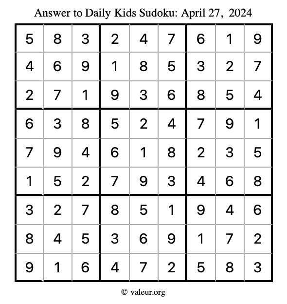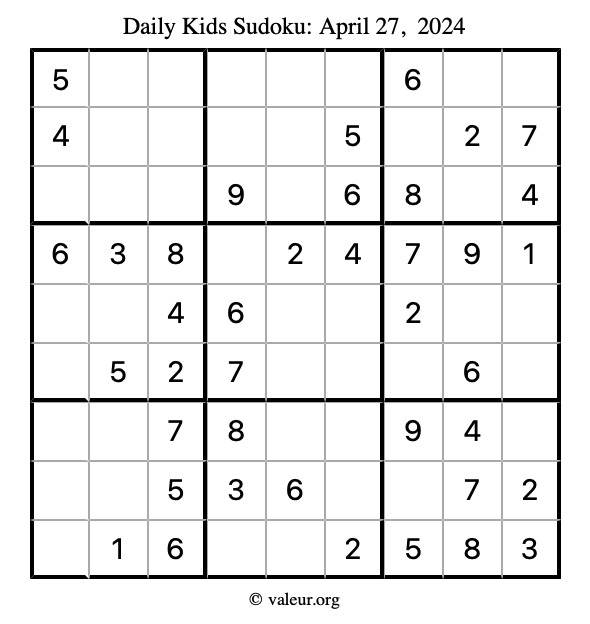 Here is the April 27, 2024 kids sudoku puzzle. You are welcome to print a copy to solve by hand. For your convenience, we have also included the solution further down the page so you can check your work.