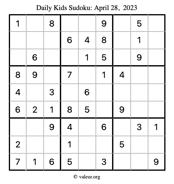 Kids Sudoku April 28, 2023 is not the only sudoku puzzle we have. We create a new kids sudoku puzzle every day for you to print and solve. Check out today's kids sudoku puzzle here!