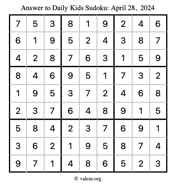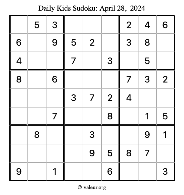 Here is the April 28, 2024 kids sudoku puzzle. You are welcome to print a copy to solve by hand. For your convenience, we have also included the solution further down the page so you can check your work.