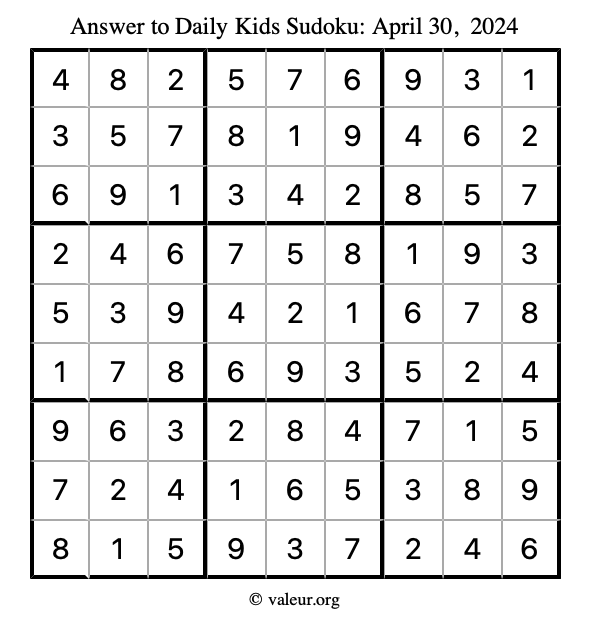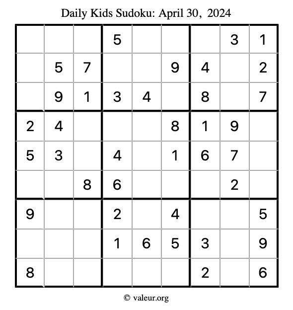 Here is the April 30, 2024 kids sudoku puzzle. You are welcome to print a copy to solve by hand. For your convenience, we have also included the solution further down the page so you can check your work.