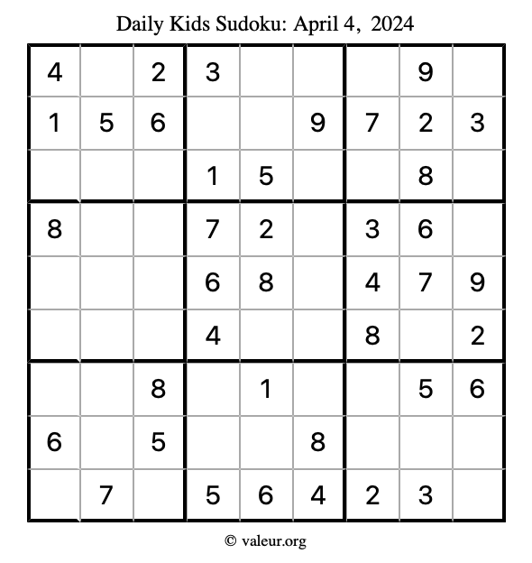 Here is the April 4, 2024 kids sudoku puzzle. You are welcome to print a copy to solve by hand. For your convenience, we have also included the solution further down the page so you can check your work.