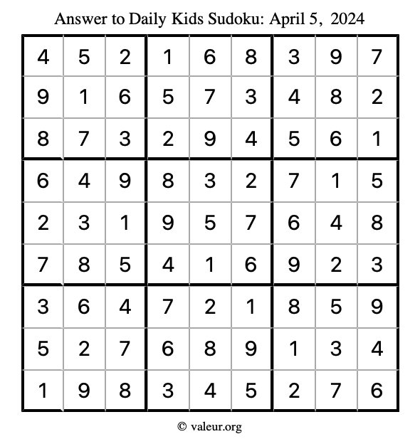 Here is the April 5, 2024 kids sudoku puzzle. You are welcome to print a copy to solve by hand. For your convenience, we have also included the solution further down the page so you can check your work.
