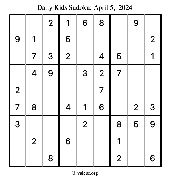 Kids Sudoku April 5, 2024 is not the only sudoku puzzle we have. We create a new kids sudoku puzzle every day for you to print and solve. Check out today's kids sudoku puzzle here!