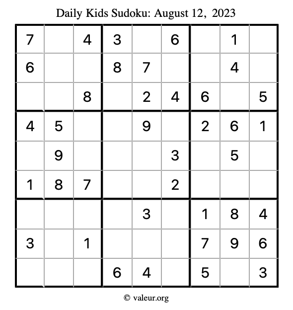 Here is the August 12, 2023 kids sudoku puzzle. You are welcome to print a copy to solve by hand. For your convenience, we have also included the solution further down the page so you can check your work.