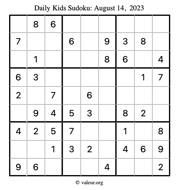 Here is the August 14, 2023 kids sudoku puzzle. You are welcome to print a copy to solve by hand. For your convenience, we have also included the solution further down the page so you can check your work.