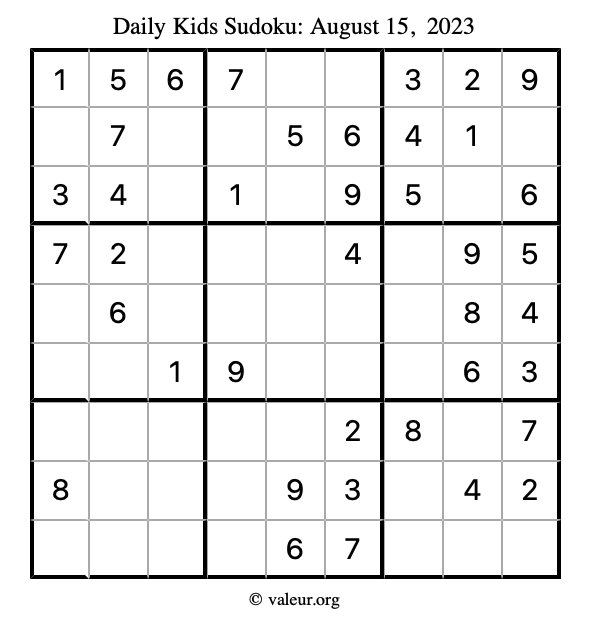 Here is the August 15, 2023 kids sudoku puzzle. You are welcome to print a copy to solve by hand. For your convenience, we have also included the solution further down the page so you can check your work.