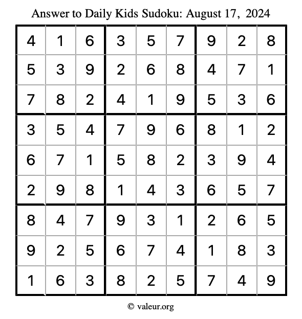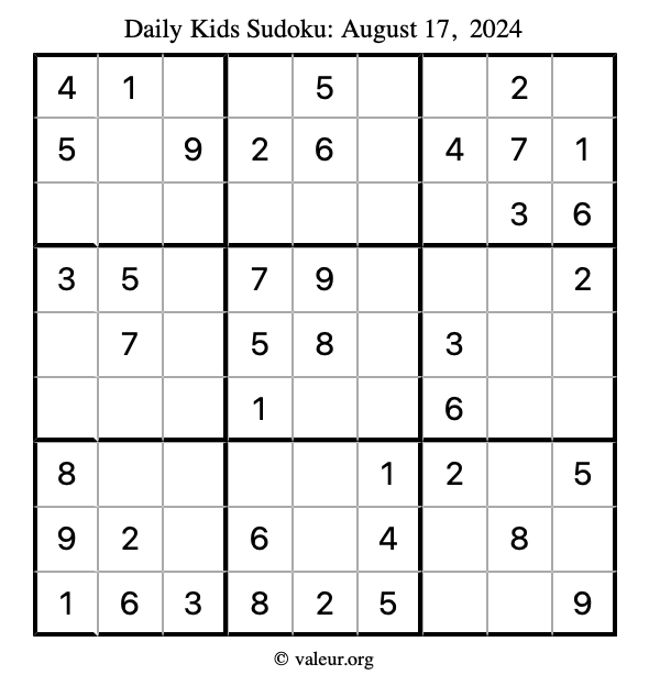 Here is the August 17, 2024 kids sudoku puzzle. You are welcome to print a copy to solve by hand. For your convenience, we have also included the solution further down the page so you can check your work.