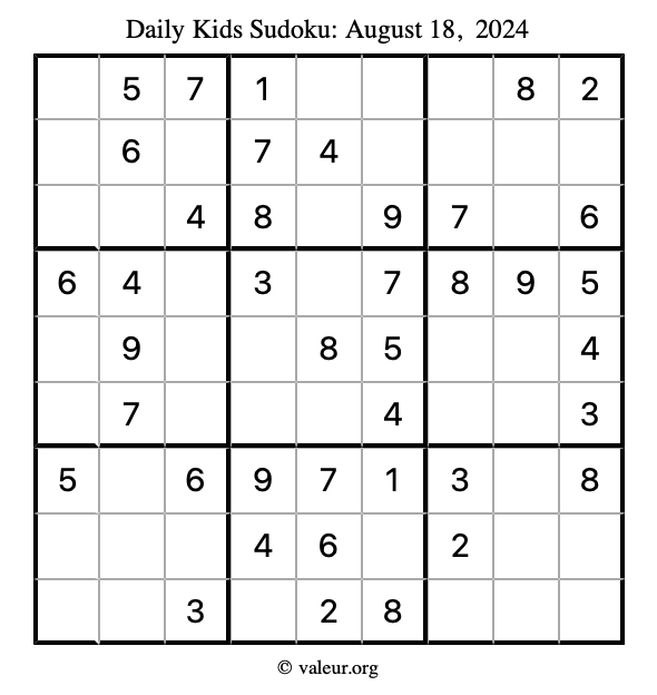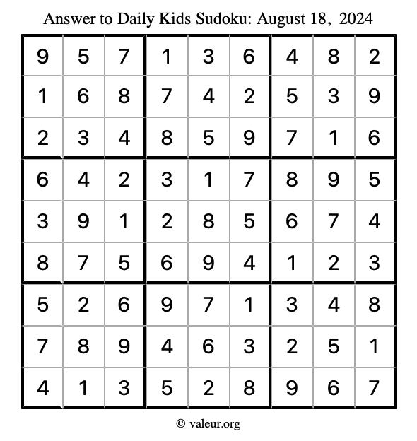 Here is the August 18, 2024 kids sudoku puzzle. You are welcome to print a copy to solve by hand. For your convenience, we have also included the solution further down the page so you can check your work.