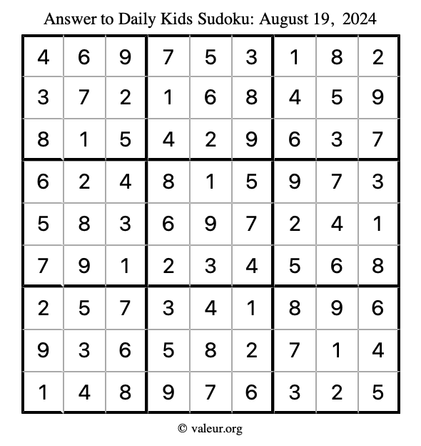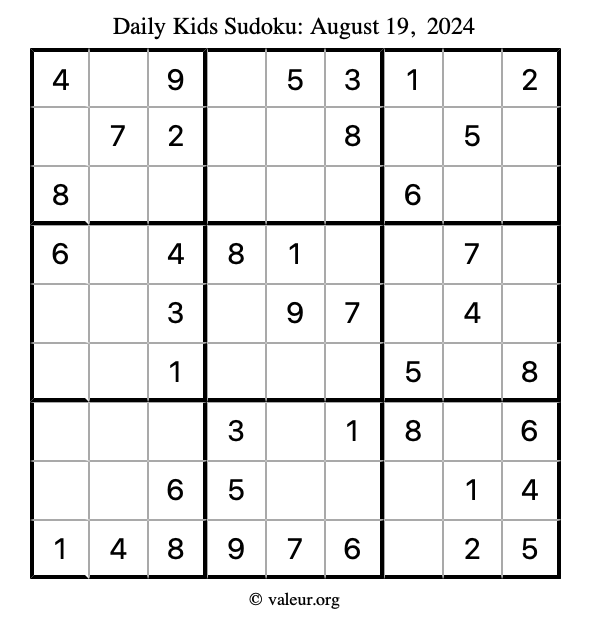 Here is the August 19, 2024 kids sudoku puzzle. You are welcome to print a copy to solve by hand. For your convenience, we have also included the solution further down the page so you can check your work.