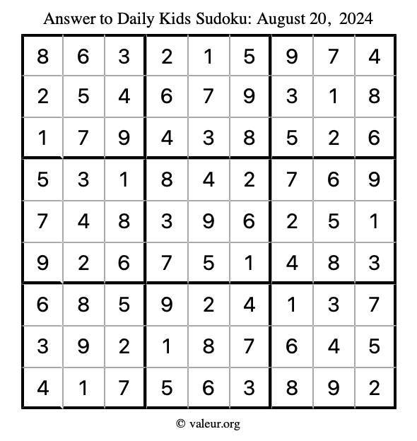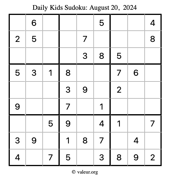 Here is the August 20, 2024 kids sudoku puzzle. You are welcome to print a copy to solve by hand. For your convenience, we have also included the solution further down the page so you can check your work.