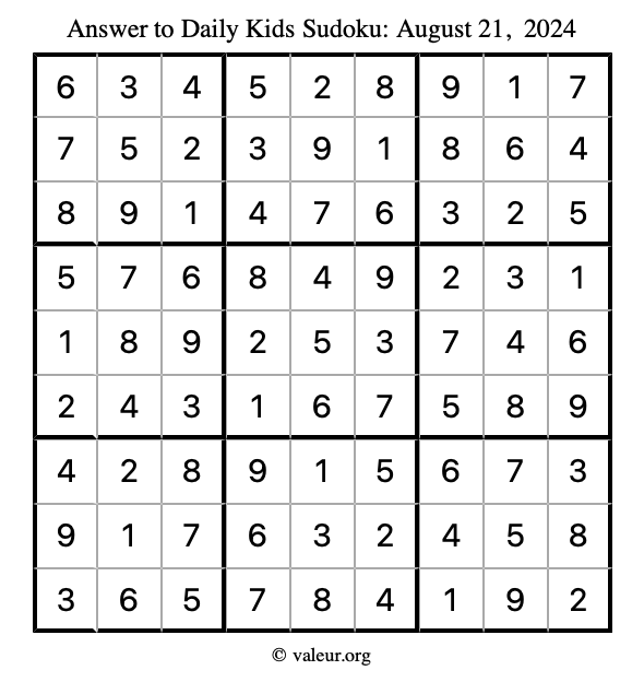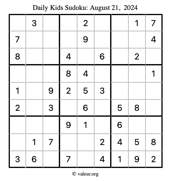 Here is the August 21, 2024 kids sudoku puzzle. You are welcome to print a copy to solve by hand. For your convenience, we have also included the solution further down the page so you can check your work.