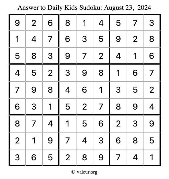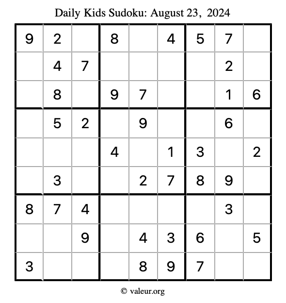 Here is the August 23, 2024 kids sudoku puzzle. You are welcome to print a copy to solve by hand. For your convenience, we have also included the solution further down the page so you can check your work.